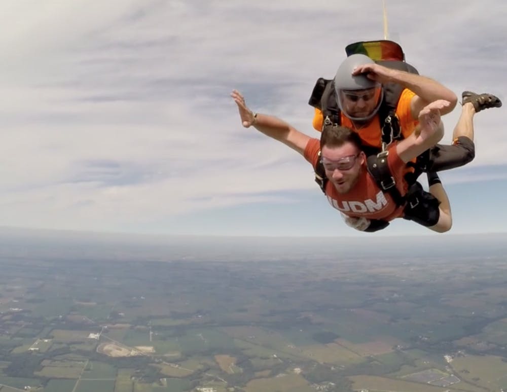 Skydivers strapped bears to their chest to later give to Riley kids.