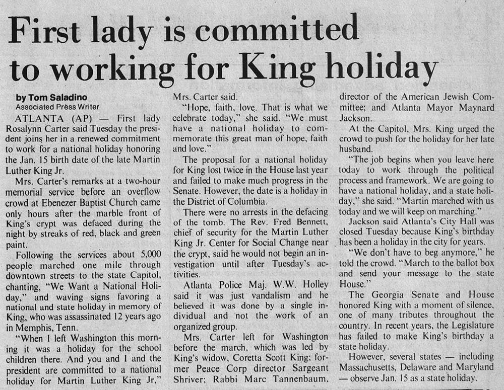 Jan. 16, 1980: ATLANTA (AP) - First lady Rosalynn Carter said Tuesday the president joins her in a renewed commitment to work for a national holiday honoring the Jan. 15 birth date of the late Mart in Luther King Jr.