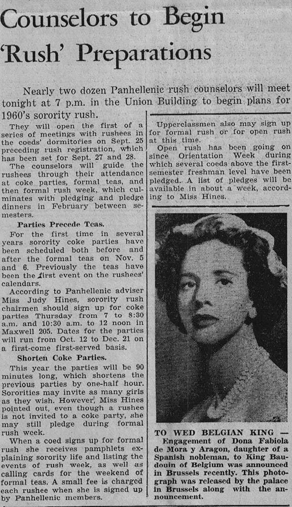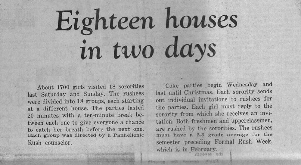 Sept. 21, 1960: Nearly two dozen Panhellenic rush counselors will meet tonight at 7 p.m. in the Union Building to begin plans for 1960’s sorority rush.
