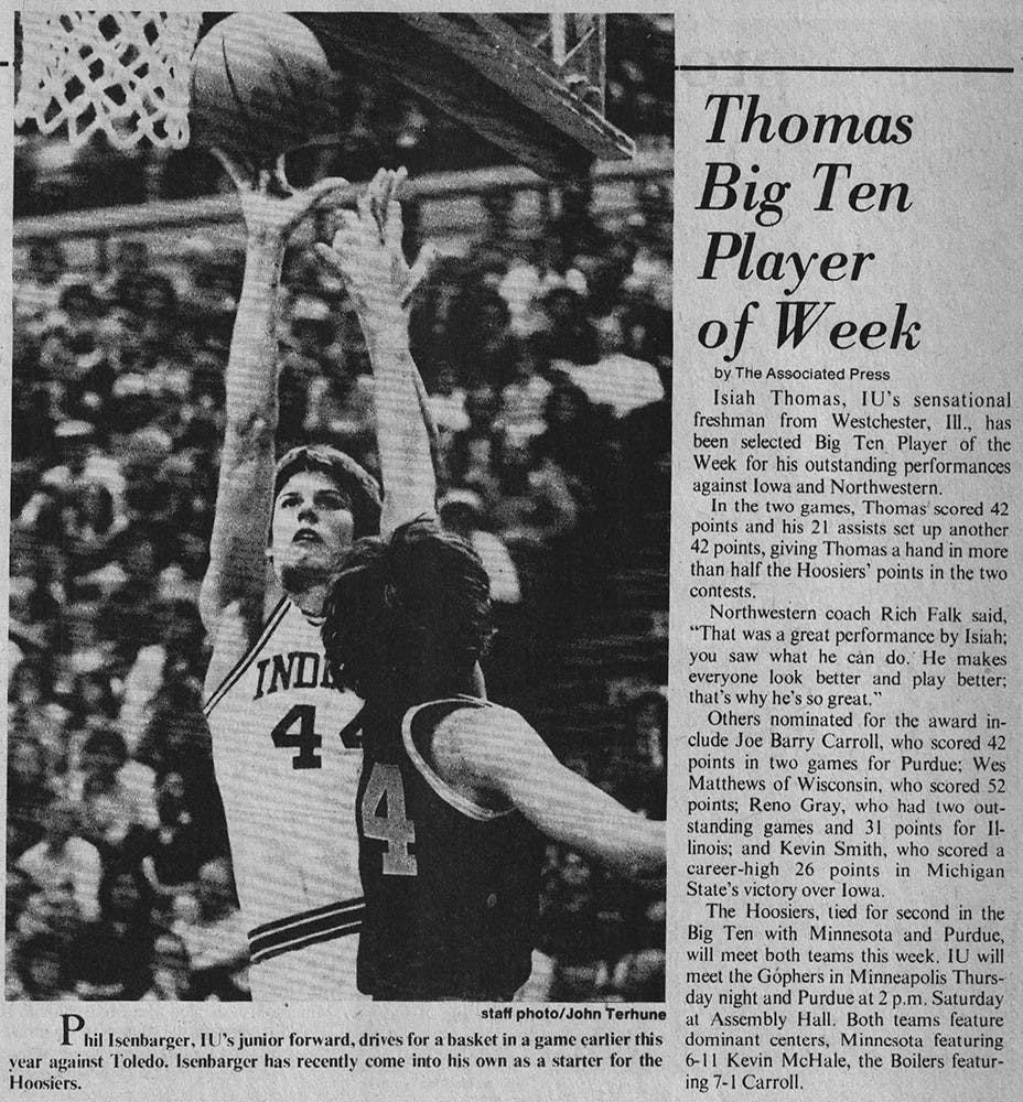 January 23, 1980: Isiah Thomas, IU’s sensational freshman from Westchester, Ill., has been selected Big Ten Player of the Week for his outstanding performances against Iowa and Northwestern.